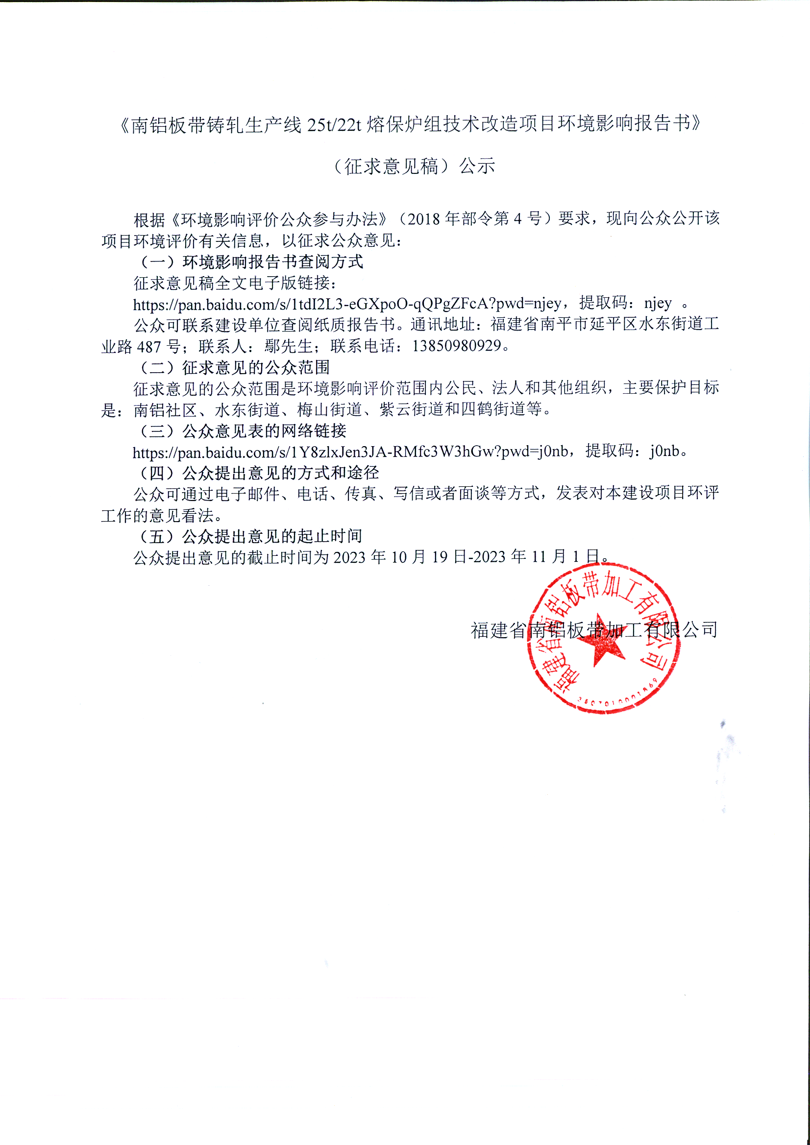 《南鋁板帶鑄軋生產(chǎn)線(xiàn)25t22t熔保爐組技術(shù)改造項目環(huán)境影響報告書(shū)》報批前公示